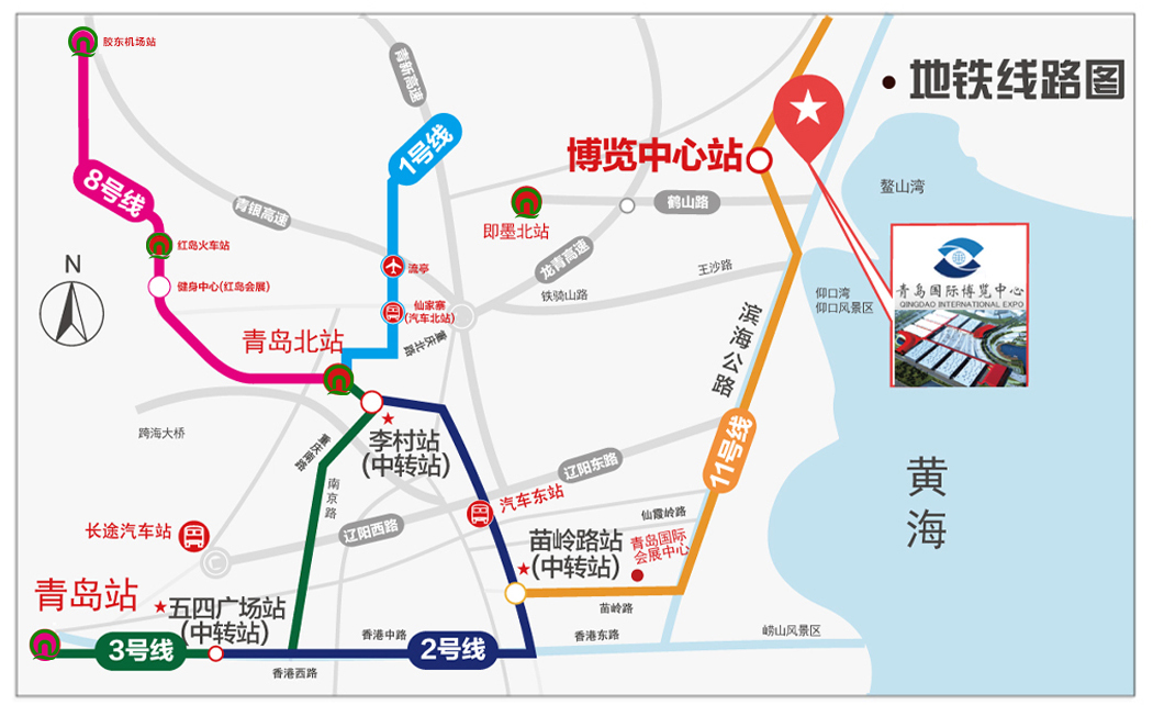 始发站 出行方式 路线 即墨汽车站 公交 即墨K103路或即墨K102路(青岛国际博览中心站) 青岛胶东国际机场 地铁 地铁8号线(青岛北站)—地铁3号线(李村站)—地铁2号线(苗岭路站)—地铁11号线(博览中心站) 青岛火车北站 公交|地铁 地铁3号线(李村站) —地铁2号线(苗岭路站) —地铁11号线(博览中心站) 青岛火车站 公交|地铁 地铁3号线(五四广场站)—地铁2号线(苗岭路站)—地铁11号线(博览中心站) 青岛国际会展中心(崂山) 公交|地铁 地铁11号线(博览中心站) 青岛汽车站(市北) 公交|地铁 32路环线(芝泉路)—地铁2号线(苗岭路站)—地铁11号线(博览中心站) 青岛汽车站(城阳) 公交|地铁 606路(李村站)—地铁2号线(苗岭路站)—地铁11号线(博览中心站)
